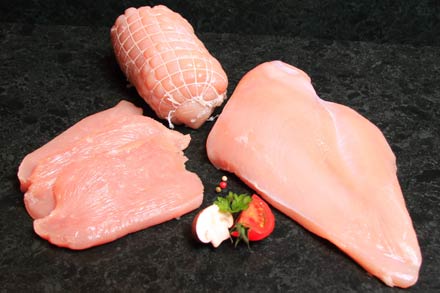 Frisches, deutsches Putenfleisch und leckere Spezialitäten, wie gefüllte Rollbraten, gefüllte Filets, Rouladen und Spieße,